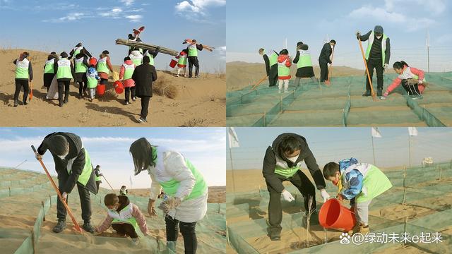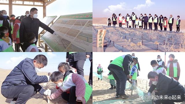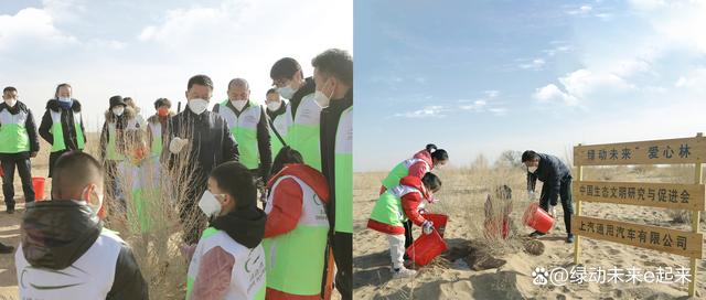 為弘揚民勤防沙治沙精神,鼓勵公眾參與助力當?shù)厣鷳B(tài)持續(xù)改善,2022年12月24日,十余組甘肅當?shù)刂驹刚?,在武威市環(huán)境保護產(chǎn)業(yè)協(xié)會和“綠動未來”平臺的帶領下,前往騰格里沙漠。大家與治沙英雄石述柱之子石光明一起,探視并養(yǎng)護了“綠動未來”民勤1號林,近距離觀摩學習了“民勤模式”科學治沙技術,并將所學轉(zhuǎn)化為切實的植樹成果,攜手在騰格里沙漠再植10,000余棵梭梭樹苗,落成又一片“綠動未來”愛心林。